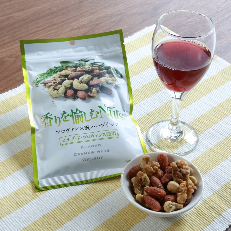 プロヴァンス地方の料理に良く使われるハーブ「エルブ・ド・プロヴァンス」とフランスの「ゲランドの塩」で味付けしました。こだわりの素材を使用した、風味豊かなハーブナッツです。
