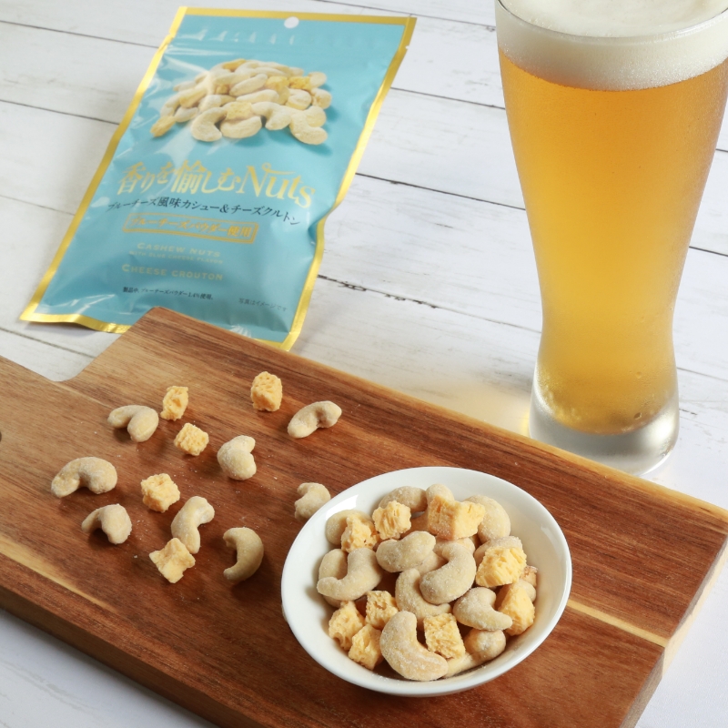 ブルーチーズ風味に仕上げたカシューナッツに、チーズを浸み込ませたクルトンをミックスさせました。チーズの香りとまろやかな味わいをお楽しみください。